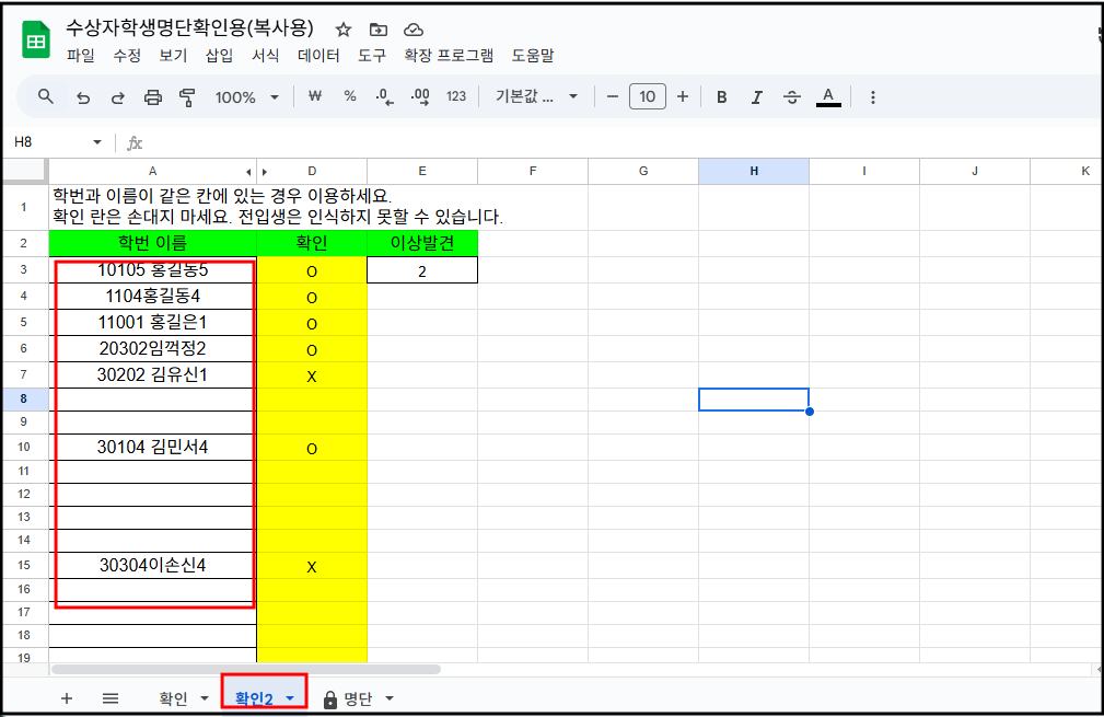 - 만약 학번과 이름이 같은 칸에 있다면 확인2 시트에 가서 붙여넣기 하면 된다.