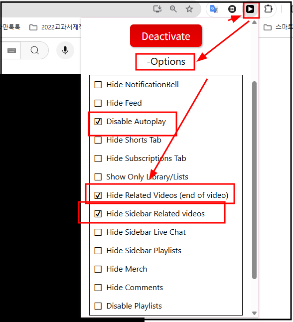 의도치 않게 수업시간에 학습관련 유튜브 영상을 보여 주다 보면, 영상이 끝난 후 관련 영상이나 추천 영상이 화면에 나타나면서 시선을 분산시키거나 곤란하게 만드는 경우가 있다.
