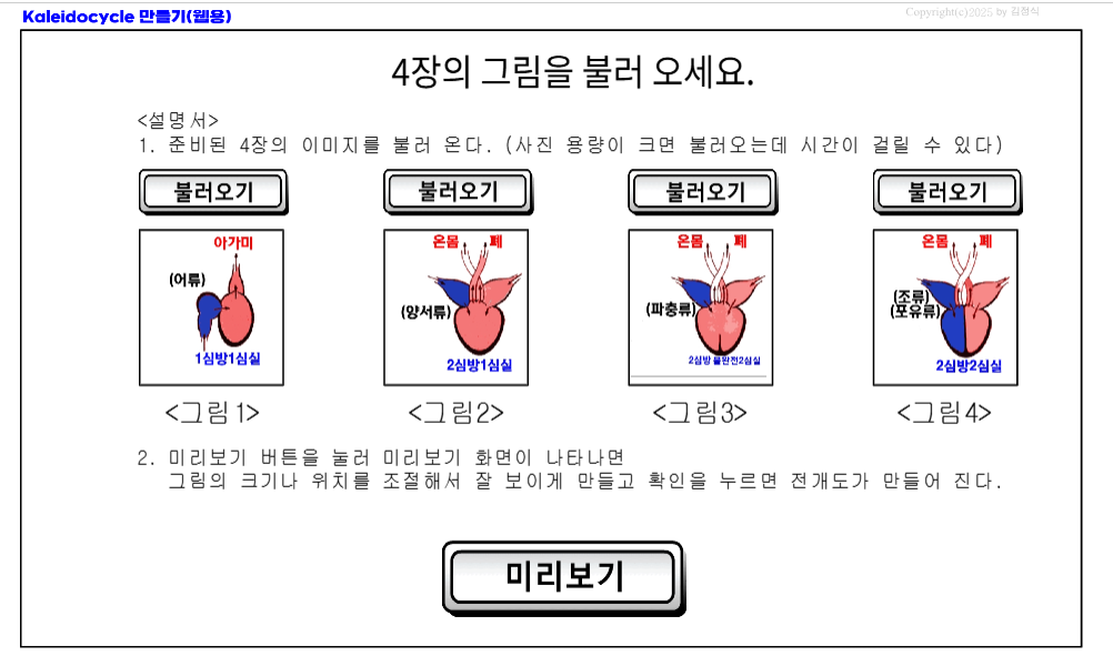 기존에 칼레이도 사이클 만들던 실행 프로그램을 웹용으로 바꾸었다. 이제 웹상에서 내가 원하는 그림 4개를 올리고 칼레이도 사이클 전개도를 만들 수 있다.