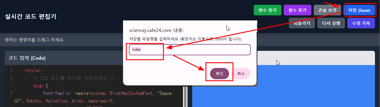 인공지능으로 만든 html 과 자바스크립트 코드를 코드 입력에 붙여 넣기 하고, 우측 상단에 저장을 누르면 index.html 파일로 저장된다. index.html 대신 원하는 이름.html 로 컴퓨터에 저장해 두면, 그 다음 부터는 저장된 이름.html 파일을 눌러서 바로 실행할 수 있다.