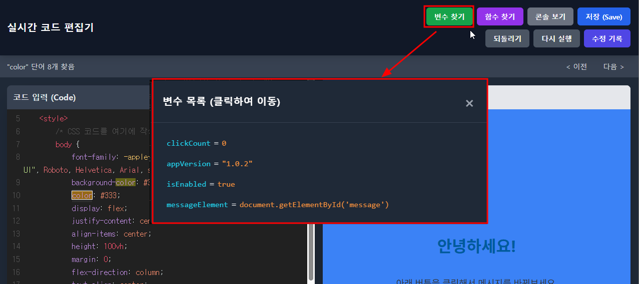찾은 변수를 누르면 그 코드입력 창에서 그 변수가 있는 위치로 이동한다.