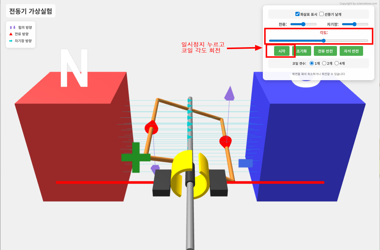 전동기 원리를 교육하기 위해 만든 가상실험 프로그램입니다. 관찰자의 위치를 바꿔가며 입체로 관찰할 수 있도록 해서 문제에서 제시되는 다양한 형태의 전동기 모습을 만들어 볼 수 있습니다
