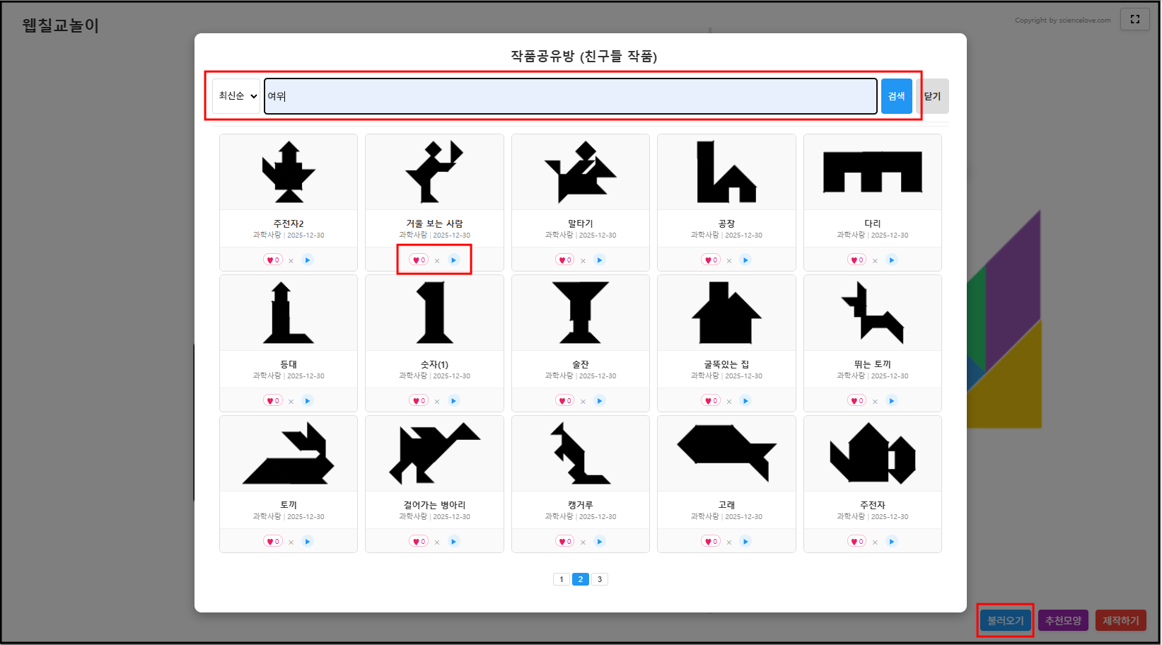 2. 불러오기를 누르면 친구들이 만든 작품공유방이 열린다. 친구들이 직접 만든 칠교놀이를 가져다가 맞춰 볼 수 있다.