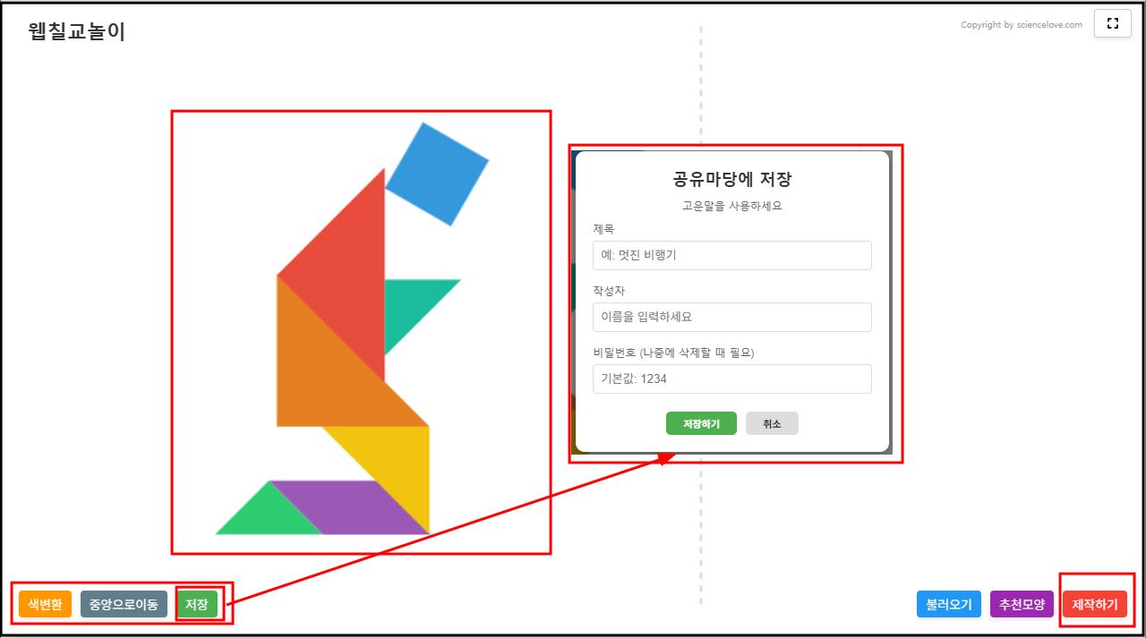 비밀번호는 기본 1234로 저장된다. 나중에 자신이 만든 칠교 조각을 지우고 싶을 때 비밀번호가 필요하다. 비밀번호를 입력해 놓면, 나중에 자신이 만든 칠교퍼즐을 검색해서 삭제할 수 있다.
