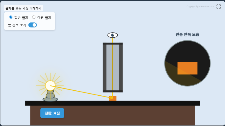 조명을 켜고 검은 상자로 물체를 덮어 보면서 물체를 보는 과정 이해하