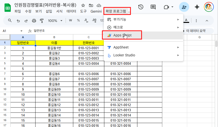 구글스프레드시트에서 자신의 학교에 맞게 명단을 수정해 주면 된다. 현재는 13반 까지 되어 있다.