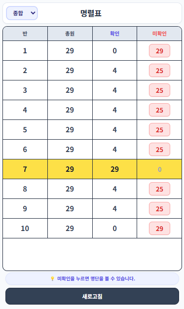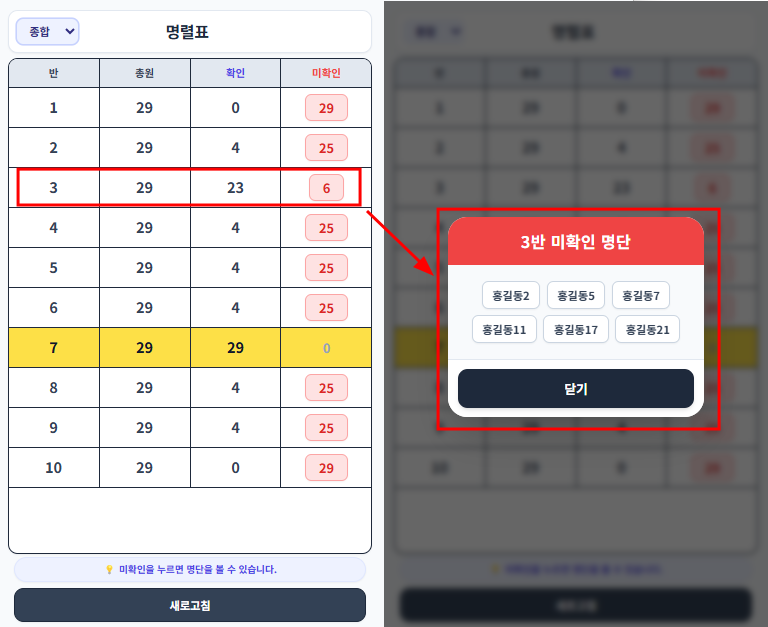 만약 3반에 아직 안 온 학생을 확인하고 싶으면 3반으로 이동해서 확인할 수도 있지만 미확인 버튼을 누르면 어떤 학생이 안 왔는지 바로 알 수 있다.
