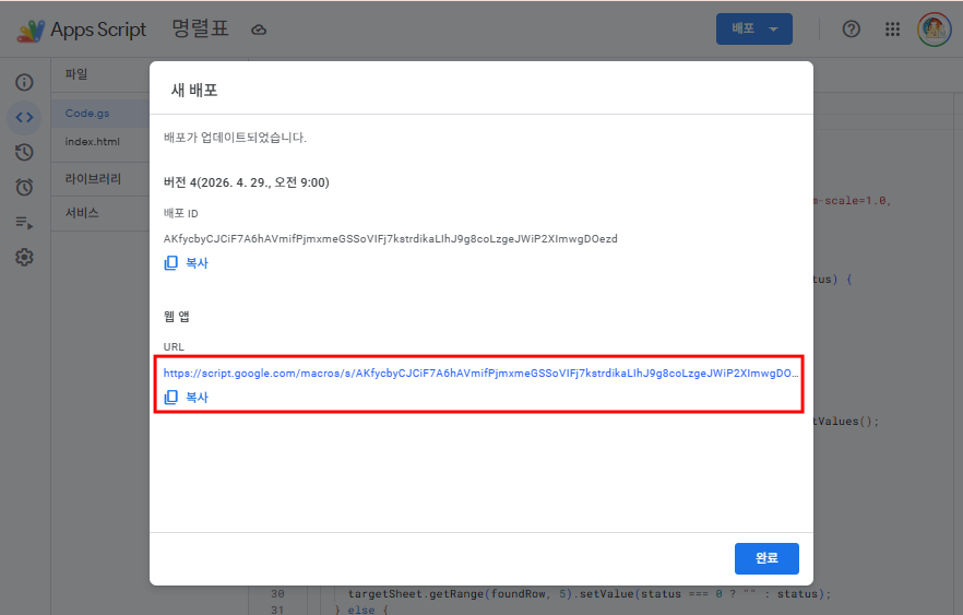 5. 웹앱을 복사해서 링크 주소로 접속해서 사용하면 된다. - 모든 반 선생님들께 링크 주소를 공유해서 함께 사용하기 바란다.