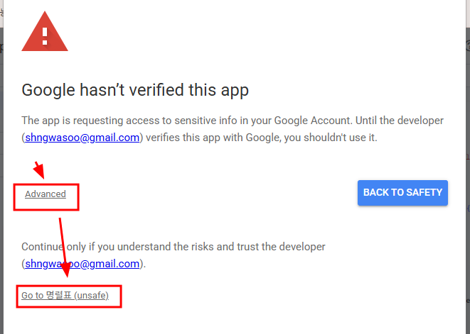 - 다음 창이 뜨면 Advanced 를 누르고 아래쪽에 안전하지 않은데 계속 하겠냐는 질문에 그냥 go to 명렬표(unsafe) 를 선택하면 된다.
