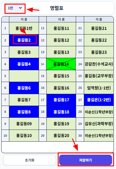 학생이름을 누르면 3단계로 색이 변한다. 처음 무색은 아직 확인하지 않은 상태, 파란색은 확인,