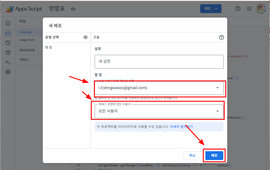 4. 아래 그림처럼 설정하고 배포를 누른다.