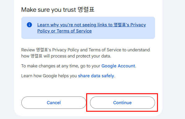 - 그리고 한번 더 묻는데 Continue 를 눌러 계속 진행하면 된다.