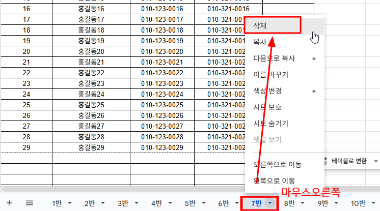 만약 우리학교가 5반이라면 6반부터 13반 까지 반별 시트는 삭제하면 된다.