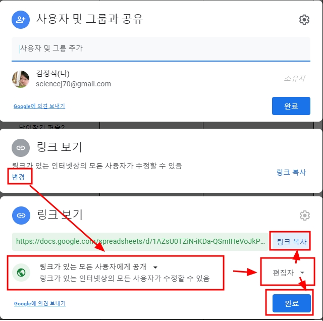 공유를 눌러 링크보기에서 변경을 누른 다음 나오는 창에서 링크가 되어 있는 모든 사람에게 허용을 하면