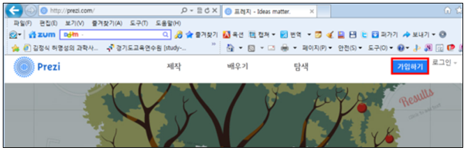 가. 프레지 홈페이지로 이동하면 위의 그림과 같은 화면이 나온다. 가입을 위해 우측 상단에 있는 가입하기를 클릭한다.