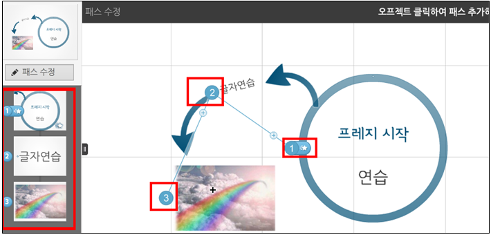 그리고 보여질 순서대로 객체를 누른다. 최초 원형프레임이 1번으로 잡혀 있기 때문에 글자연습을 누르고 그 음 그림을 누른다. 그러면 그림처럼 자동으로 번호가 매겨지면서 줄이 그어지게 된다. 또한 파워포인트처럼 왼쪽 화면에 보여질 순서대로 화면들이 정렬해서 나타나게 된다.