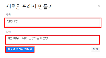 제목에는 프레지의 제목을 입력하고 설명란에는 만드는 프레지에 대한 간단한 설명을 적는다. 설명은 반드시 입력해야 하는 것은 아니다. 하지만 제목은 반드시 입력해야 한다. 제목이 파일명과 같은 역할을 하기 때문이다.