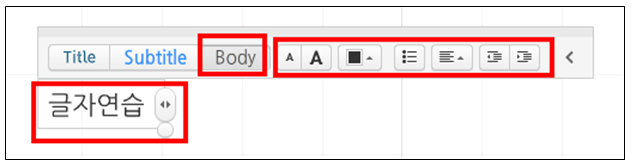 쓰고 싶은 글자를 적어 넣으면 된다. 여기에서는 ‘글자연습’이라고 적어 보았다. 위쪽에 보면 body가 선택되어 있다. 즉 지금 적은 글자는 본문내용이라는 의미이며 제목이나 부제목으로 사용하는 글자가 아니라는 뜻이다. 글자크기나 색깔 정렬방식등도 이곳에서 바꿀 수 있다.