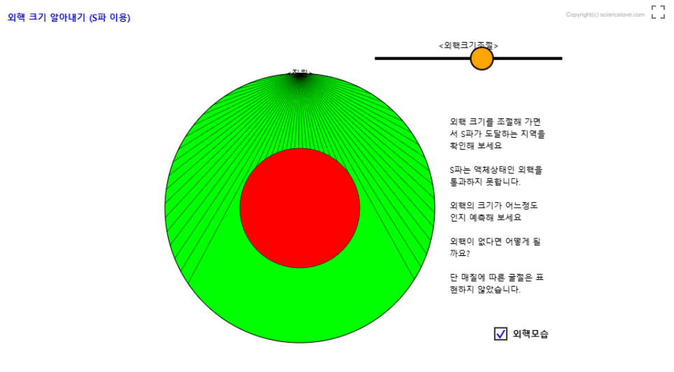 외핵을 보여주지 말고 상황만을 보여주면서 외핵의 크기를 어떻게 알아낼 수 있었는지를 생각해 보게 하면 좋을 것 같네요.