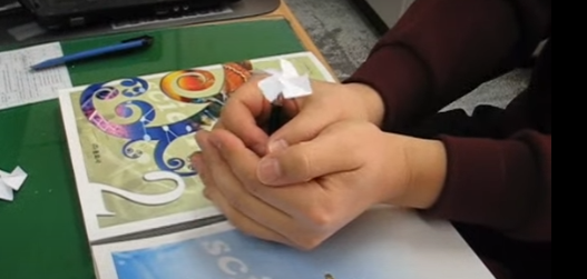 칼이나 가위로 잘라 바람개비 모양으로 접은다음